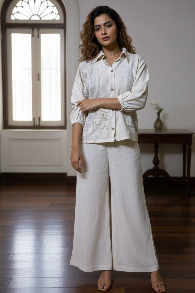 Soft, timeless, and effortlessly refined — this ivory co-ord set is crafted in breathable cotton flex for everyday ease. The shirt is detailed with a delicate hand-embroidered sunflower motif, created using fine running stitch that adds subtle texture and artisanal charm.