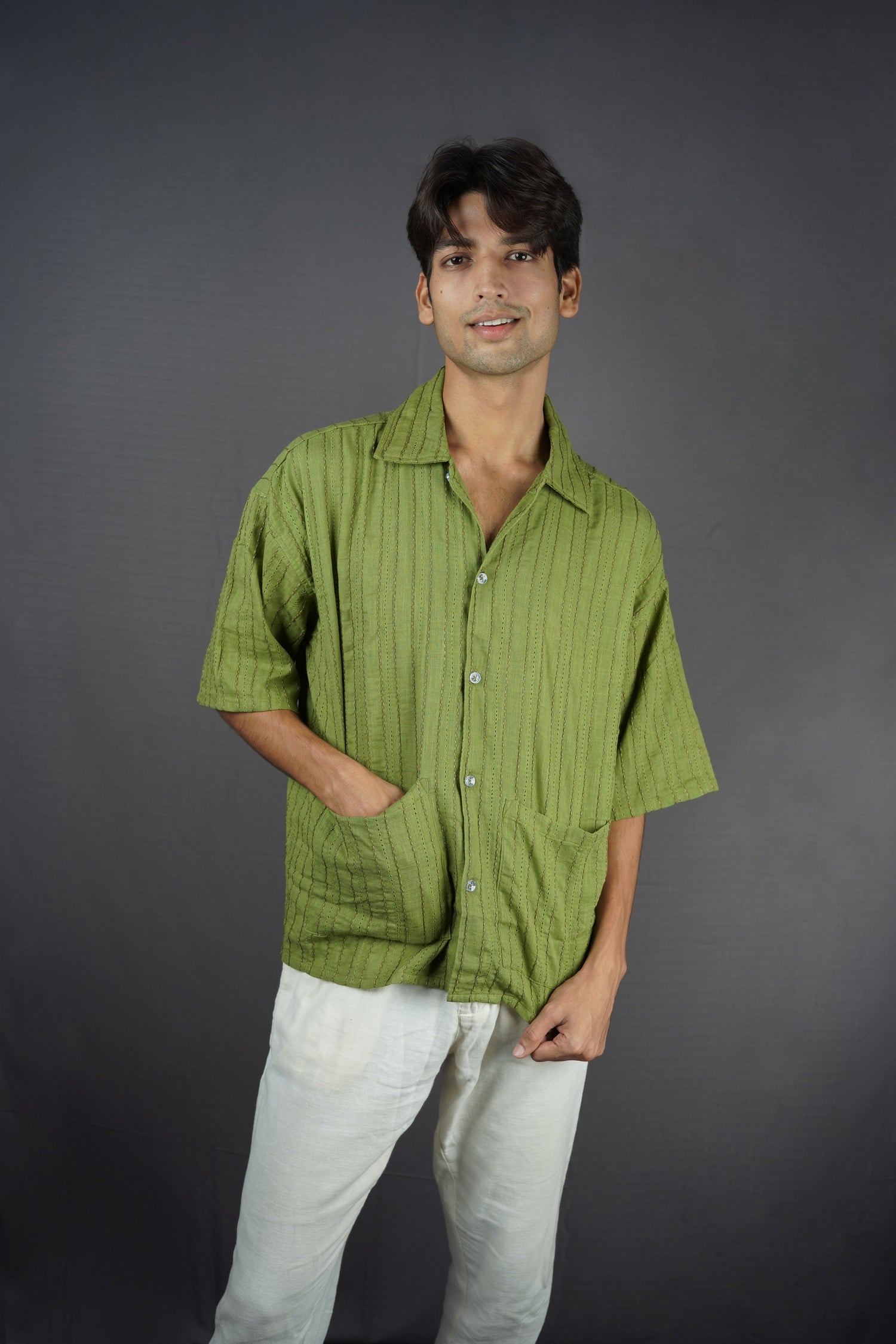 Olive green all-over threadwork oversized shirt.